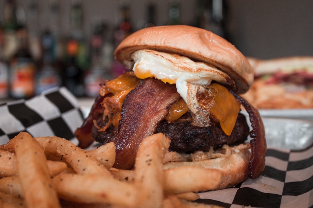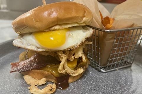 6 oz. Angus patty, cheddar cheese, bacon, fried onions, fried egg, and dill pickles on a brioche bun