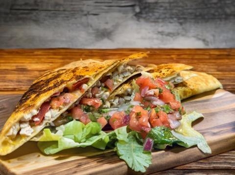 Quesadilla stuffed with chicken, pico de gallo, jalapeños, and cheddar cheese, served with salsa and sour cream