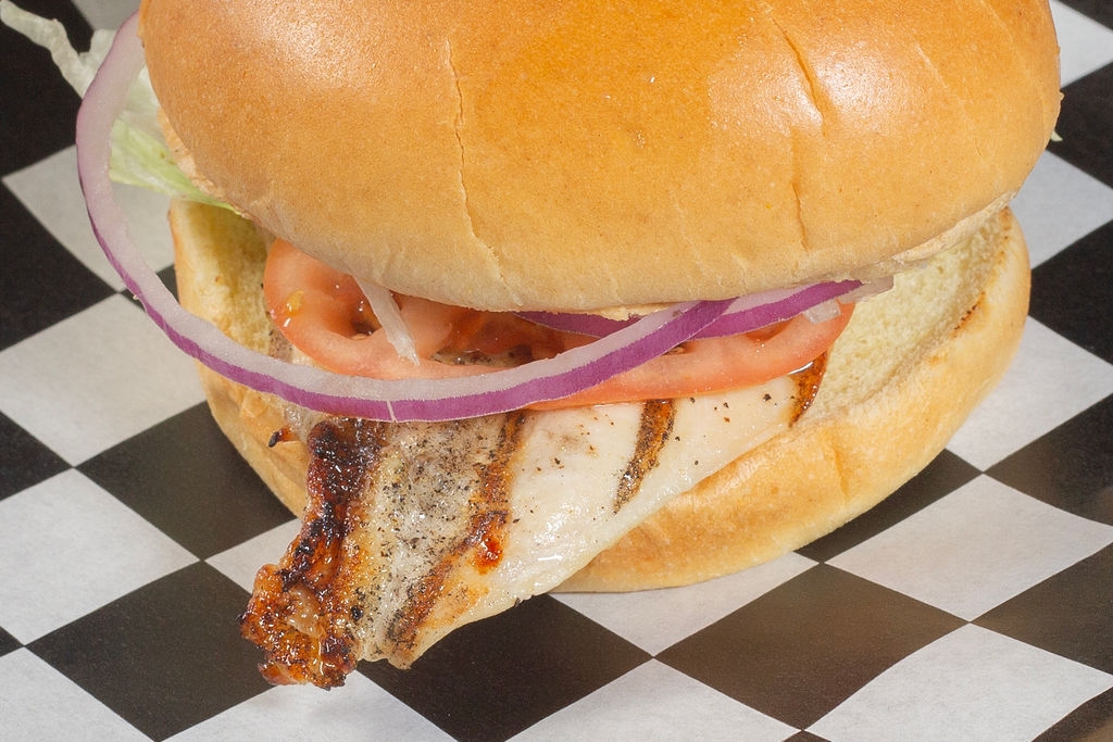 Marinated grilled or breaded chicken with lettuce,tomato & onion on a brioch bun, plus choice of toppings: