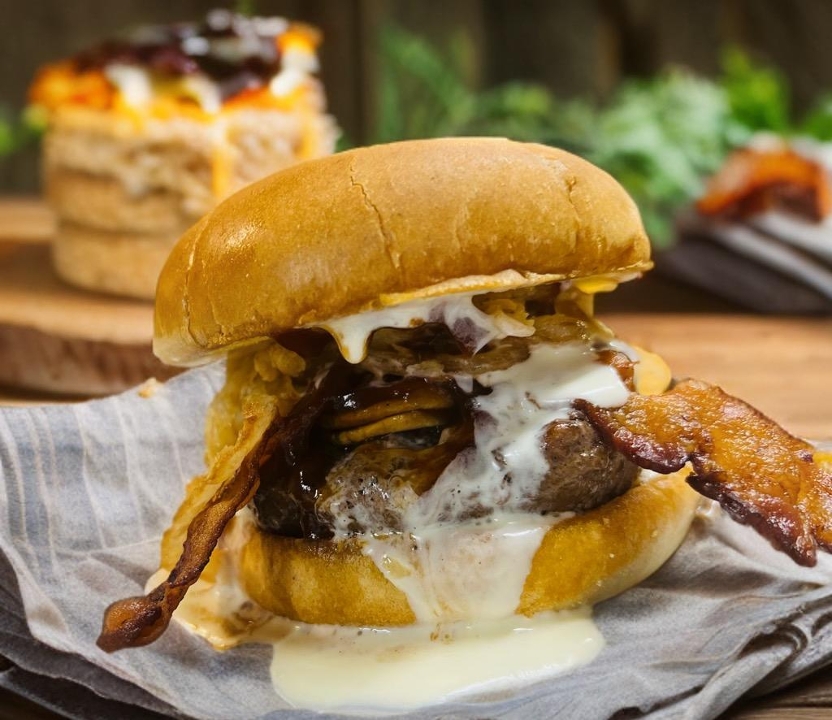 6 oz. Angus patty, sautéed mushrooms, bacon, fried onions, queso, and BBQ sauce on a brioche bun