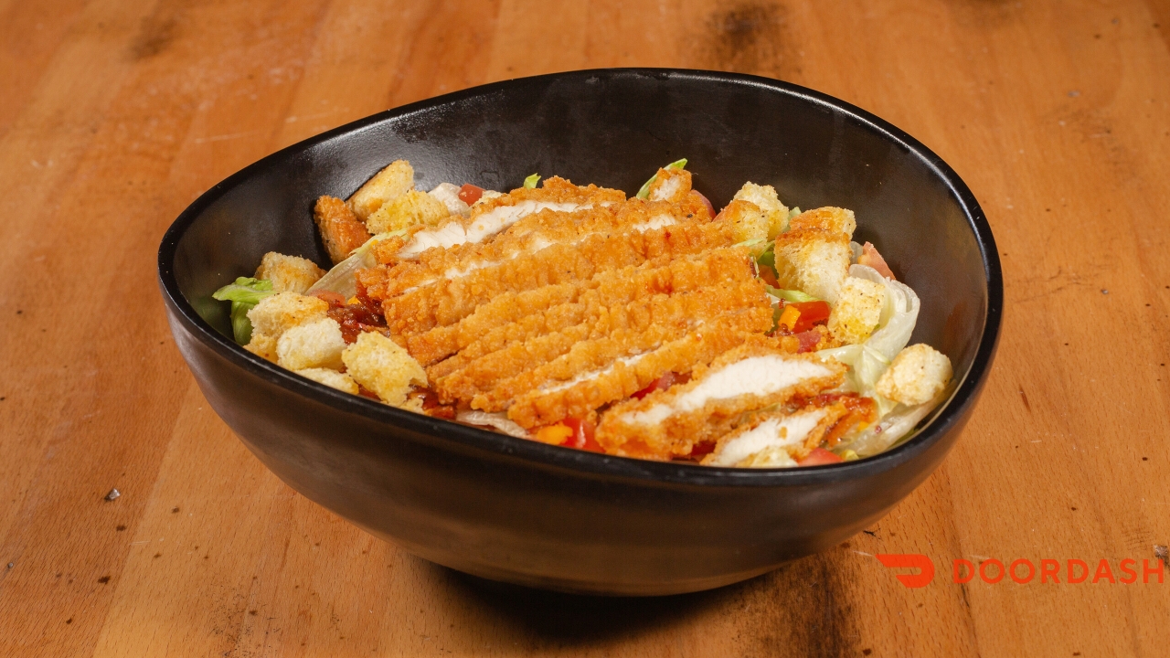 Grilled or breaded chicken, bacon, iceberg, tomatoes, shredded cheddar cheese, and croutons tossed in house-made ranch dressing.