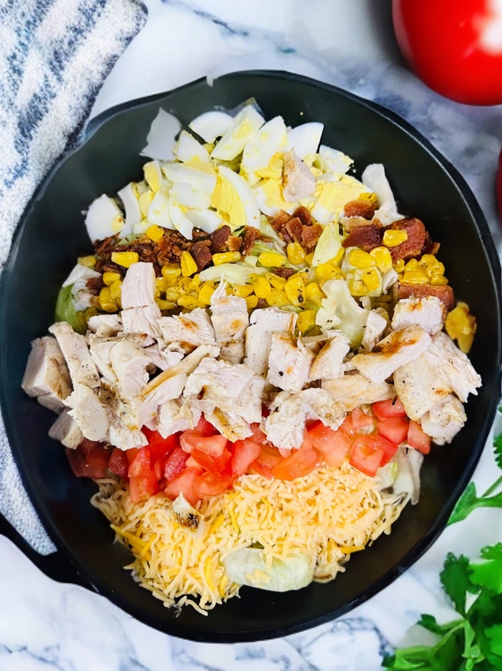 Chef salad: iceberg lettuce with tomato, roasted corn, bacon, cheddar cheese, hard-boiled eggs, and your choice of ham, turkey, or chicken, plus your choice of dressing