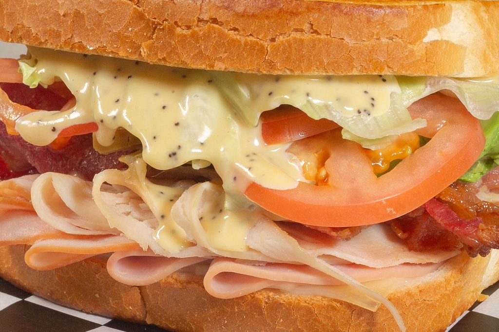 A trio of smoked meats-applewood smoked turkey, cherrywood smoked ham, and applewood smoked bacon, topped with dijonaise, Swiss cheese, lettuce, and tomato on grilled sourdough