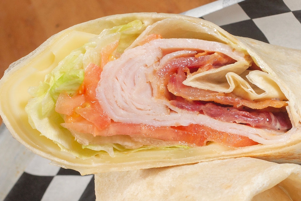 Smoked turkey, swiss cheese, and smoked bacon in a wrap with lettuce tomatoes, and dijonnaise