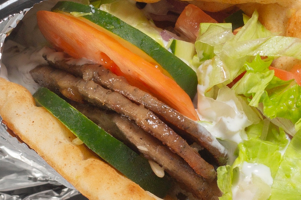 A classic gyro: perfect blend of tender, thinly sliced seasoned lamb and beef, accompanied by fresh, crisp lettuce, juicy tomatoes, cucumber, and tangy onions, all nestled in a warm and fluffy pita bread. Topped with a generous drizzle of our homemade tzatziki sauce